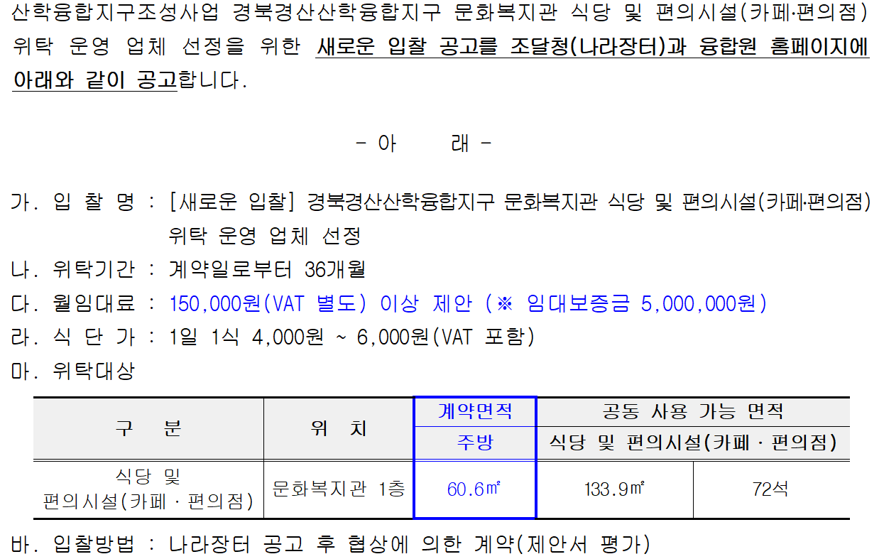 [새로운 입찰] 경북경산산학융합지구 문화복지관 식당 및 편의시설(카페·편의점) 위탁 운영 업체 선정